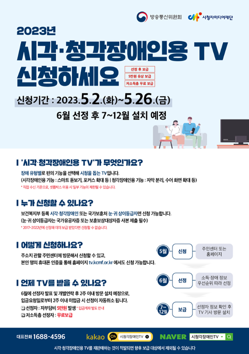맞춤형TV 보급 신청·접수는 2일부터 오는 26일까지 시청자미디어재단 시각·청각장애인용 TV 보급 전용 누리집( tv.kcmf.or.kr )에서 온라인으로 신청하거나 주민등록지 관할 읍·면·동 주민센터를 방문해 신청하면 된다.