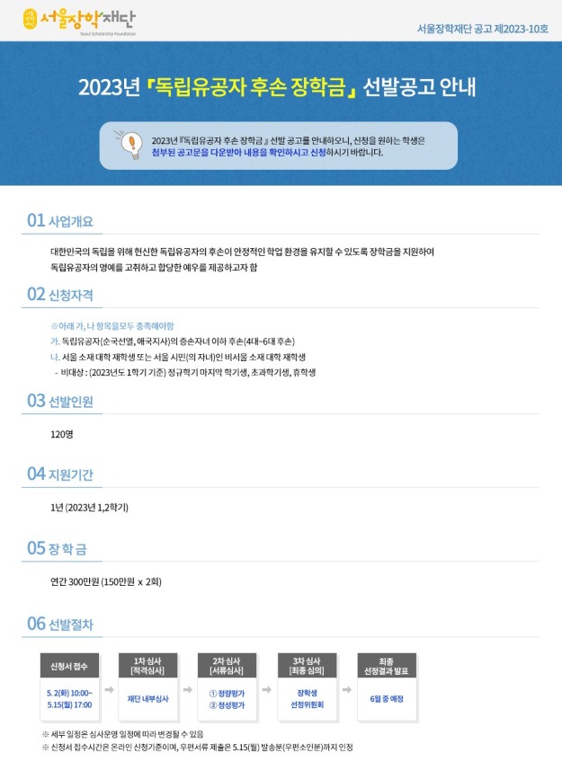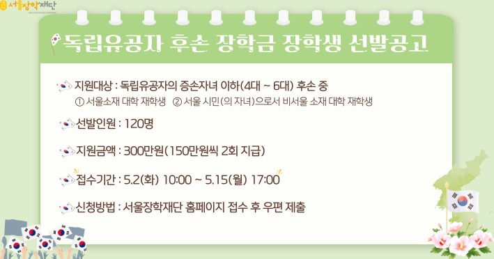 서울장학재단(이하 재단)은 국가를 위해 헌신한 독립유공자의 4대 이하 후손들에게 장학금을 통해 안정적 학업환경을 지원하기 위해 2023년도 <독립유공자 후손 장학금>을 모집하고 지원 인원도 120명으로 확대한다.