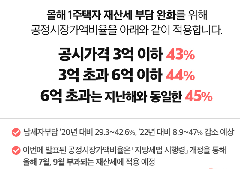 행정안전부는 1주택자 재산세 부담 완화를 위해 지난해 한시적으로 낮췄던 공정시장가액비율을 공시가격 3억 이하는 43%, 3억 초과 6억 이하는 44%, 6억 초과는 지난해와 동일하게 45%를 적용한다고 2일 밝혔다.