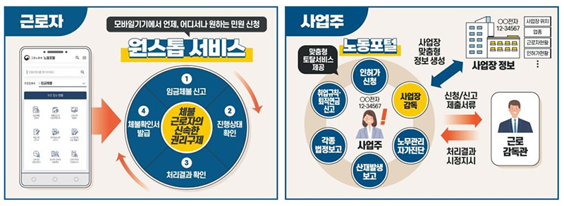 이 서비스로 청년 등 근로자가 방문 없이 민원을 신청해 그 처리상황을 실시간으로 확인하고 체불임금 확인서 발급까지 가능하며, 사업주도 각종 인허가 등 신청을 노동포털을 통해 할 수 있다.