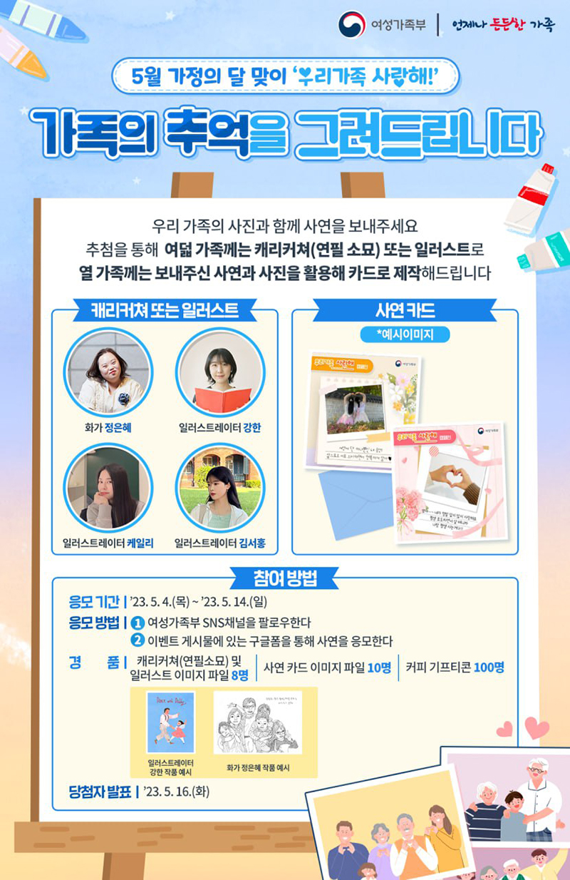유명 작가들이 직접 그린 그림 선물을 받는 여덟 가족 외에도 열 가족의 사진과 사연을 콘텐츠로 제작해 이달 말부터 여가부 인스타그램 계정에서 작은 전시회를 진행할 계획이다.