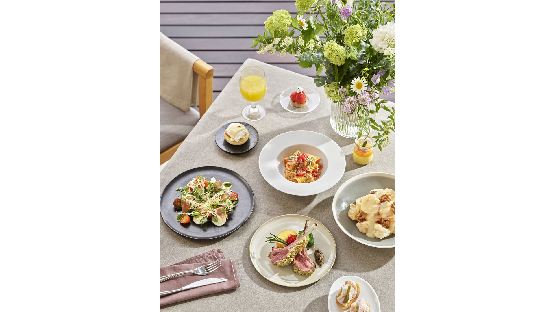 브런치 뷔페 메뉴로는 바질향의 빵가루를 묻혀 구운 ‘양갈비’와 프랑스의 대표적인 달팽이 요리인 ‘에스카르고’, 독일식 족발 요리인 ‘슈바인학센’ 등 이국적인 요리들이 마련됐다. 또한 수란을 곁들인 사워도우 빵과 야채 구이 등으로 구성된 브런치 플레이트를 비롯해 계절 채소 요리 등도 있다. 과일 타르트, 까눌레, 마카롱 등의 디저트가 3단 트레이에 담겨 각 테이블로 제공되며, 쇼트케이크, 푸딩 등 풍성한 디저트가 준비돼 커피와 함께 맛볼 수 있다.