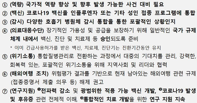 이는 ▲변이 심각성이 낮고 확진자 발생이 감소하는 점 ▲전 세계적인 SARS-CoV-2 바이러스 유행이 지속되더라도 예상치 못한 위험을 초래하지는 않는 점 ▲의료체계 회복탄력성 증가로 코로나19 환자 대응 및 기타 의료서비스 유지가 가능한 점 등을 고려한 것이다.