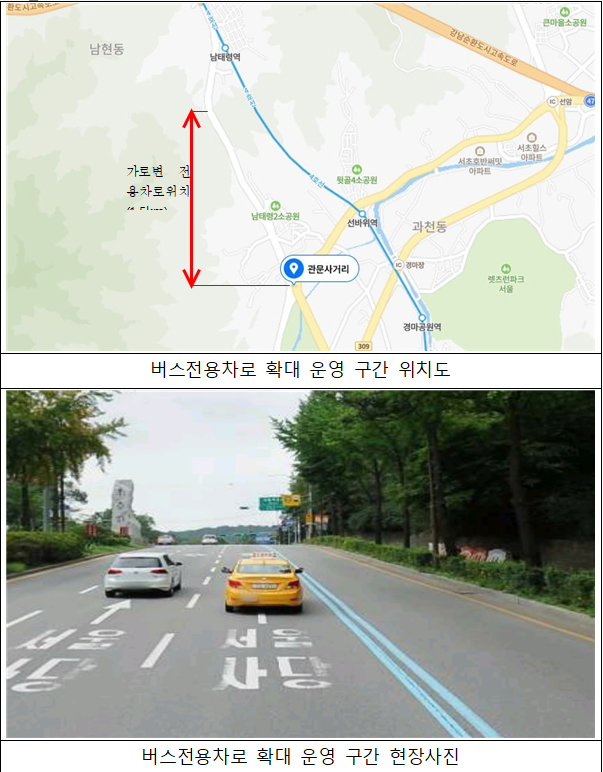국토교통부 대도시권광역교통위원회(대광위)와 과천시는 과천대로 관문사거리∼남태령 정상 약 1.5km 구간의 가로변 버스전용차로 운영시간을 기존 ‘평일 오전 7시∼오후 9시’에서 주말·공휴일을 포함한 ‘매일 오전 7시∼오후 9시’로 확대 운영한다고 7일 밝혔다.