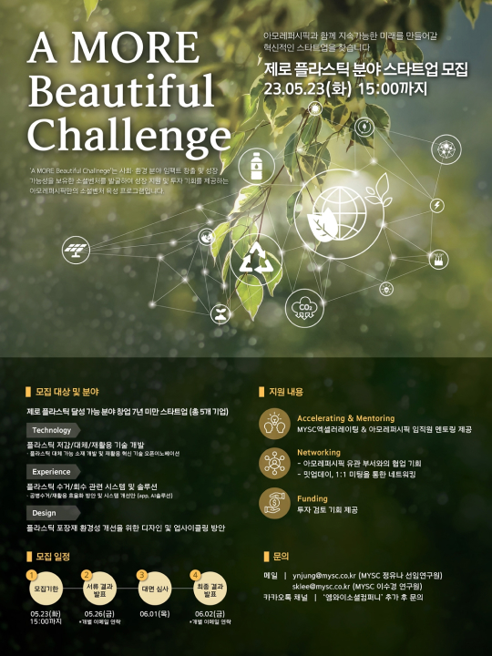 아모레퍼시픽이 주관하고 임팩트 투자사 엠와이소셜컴퍼니(MYSC)가 운영하는 ‘A MORE Beautiful Challenge’는 환경·사회 분야 스타트업을 발굴하여 아모레퍼시픽과의 협업 및 투자를 연계하는 프로그램으로 올해 2년 차를 맞이했다. 2023년에는 ‘제로 플라스틱’을 주제로 △플라스틱 저감/대체/재활용 기술을 보유한 스타트업 △플라스틱 수거/회수 시스템 기술을 개발하는 스타트업 △디자인/업사이클링을 통해 포장재의 환경성을 개선하는 스타트업을 중점 모집할 계획이다.