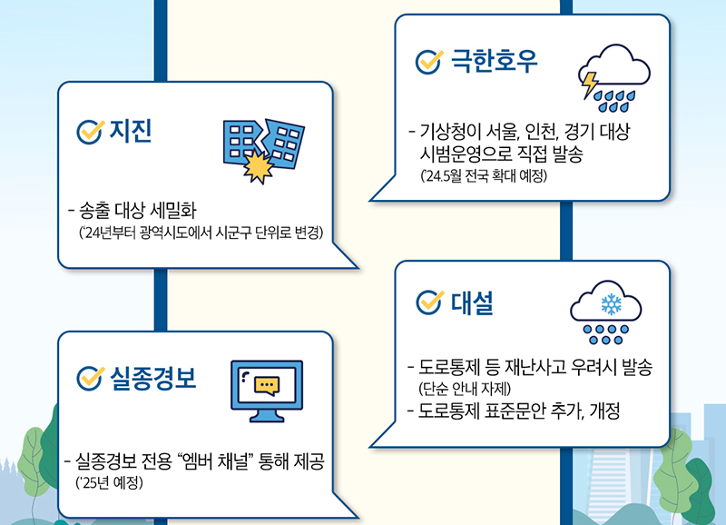 이에 지진 발생 시 진동을 못느끼는 원거리 주민에는 재난문자를 발송하지 않고, 대설의 경우 도로통제 시에만 발송하고 단순안내는 송출을 자제할 방침이다.