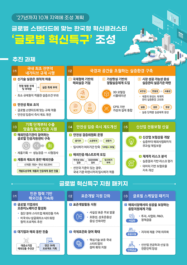 ‘글로벌 혁신 특구’에서는 명시적으로 열거된 제한·금지사항을 제외한 신기술을 활용한 모든 실증이 가능하다. 또 해외 실증거점이 구축되고 제품 기획 단계부터 수출 맞춤형 해외인증 지원이 이뤄진다.