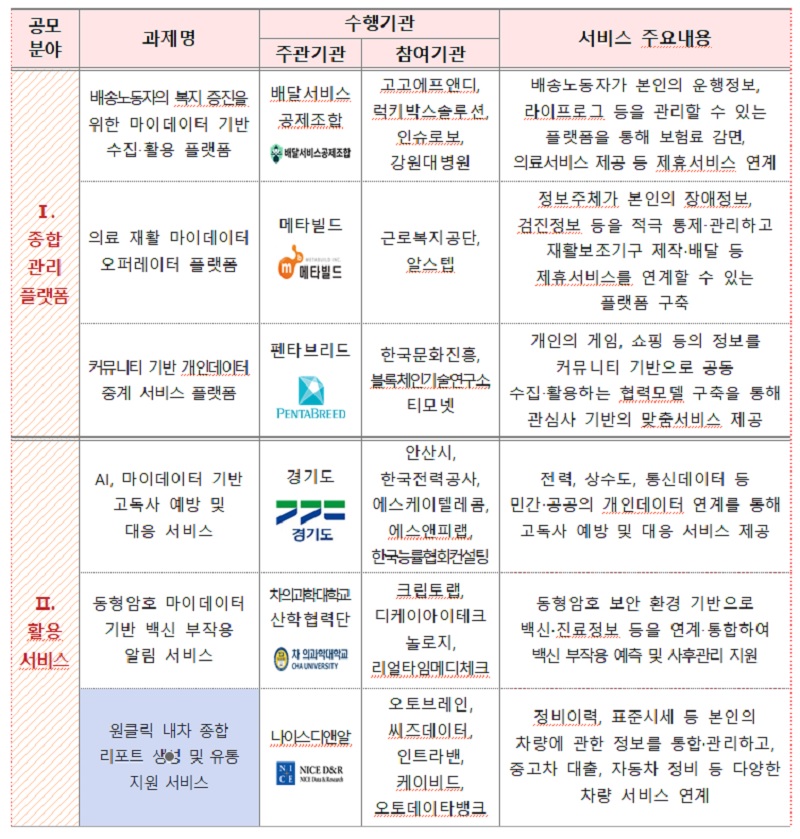 선정된 과제는 마이데이터를 활용한 종합관리 플랫폼 개발 사업 3건, 다양한 데이터를 연계해 개인별 맞춤형 서비스를 제공하는 활용 서비스 개발 사업 3건이다.