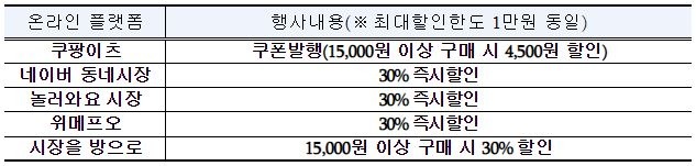 아울러 비대면·온라인 소비문화의 확산으로 어려움을 겪고 있는 전통시장을 지원하기 위한 ‘전통시장 온라인 특별할인판매전’도 이달 15일(월)부터 31일(수)까지 이어진다.