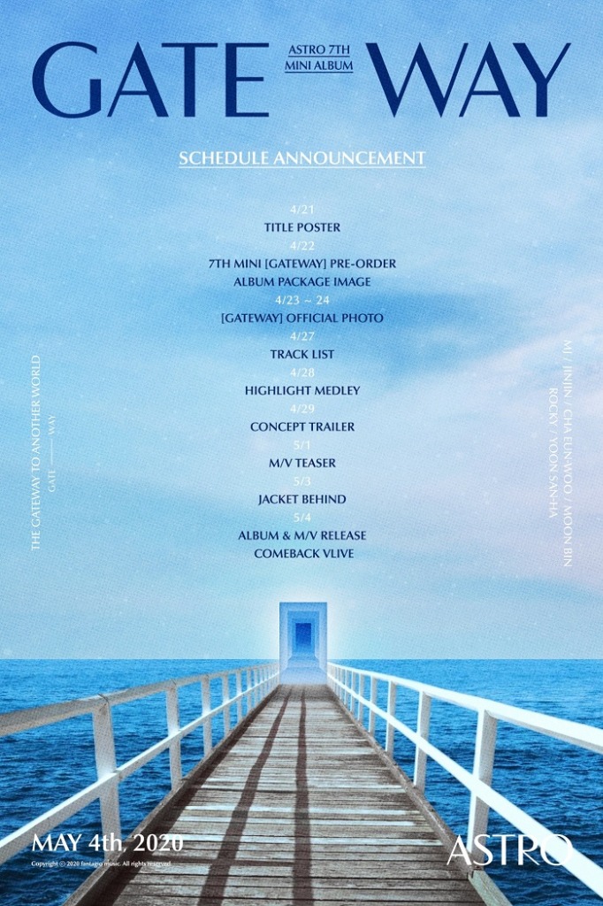 소속사 판타지오뮤직은 아스트로(MJ, 진진, 차은우, 문빈, 라키, 윤산하) 공식 SNS 채널을 통해 새 미니 앨범 ‘GATEWAY’의 플랜 포스터를 공개해 본격적인 컴백 준비를 알렸다.
