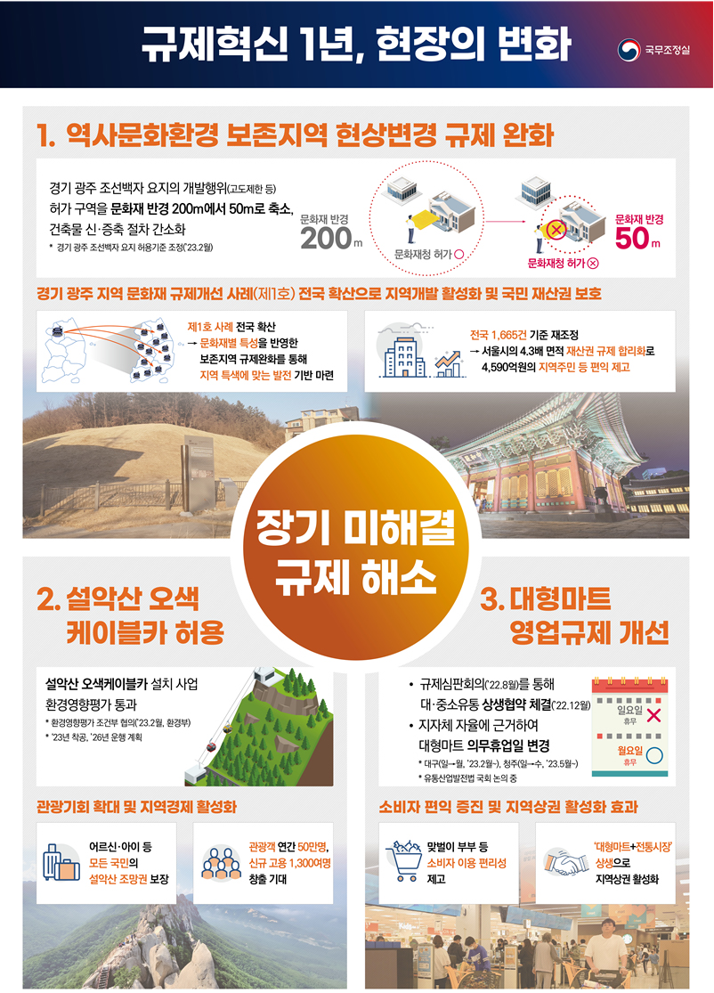 문화재청이 문화재 보존지역에 따른 주거·상업·공업지역의 개발행위 제한 범위를 기존 500m에서 200m 이내로 변경한 것도 규제개선 사례로 제시됐다.