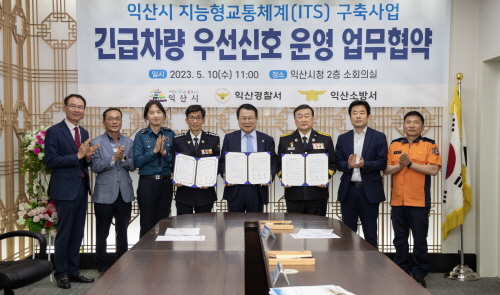 시는 10일 익산경찰서, 익산소방서와 시청 회의실에서 긴급차량 우선신호 운영을 위한 업무협약을 체결했다.