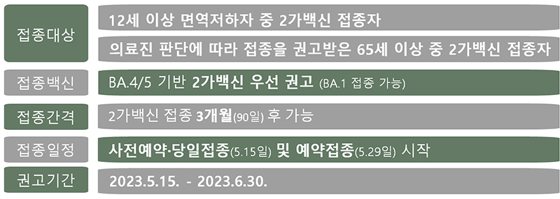 이에 질병청은 면역저하자의 면역 획득력이 낮고 면역의 지속기간이 짧은 것을 고려해 중증·사망 예방을 위해 2023년 동절기 접종 이전에 상반기 추가접종을 실시한다고 밝혔다.