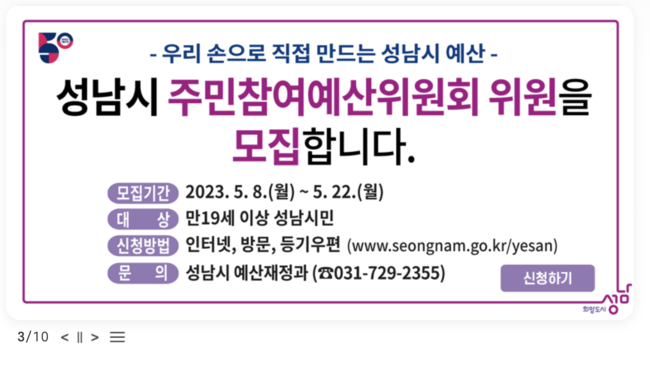 참여 자격은 공고일(5월 8일) 기준 성남시에 주소를 둔 만 19세 이상 시민과 지역 내 기관·사업체 근무자다.