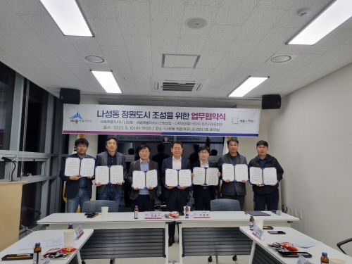 나성동은 10일 주민센터에서 세종특별자치시산림조합(조합장 안종수), 나성동 공동주택(나릿재마을) 6개 단지 입주자대표회의 회장들이 참석한 가운데 '나성동 정원도시 조성을 위한 업무협약'을 체결했다.