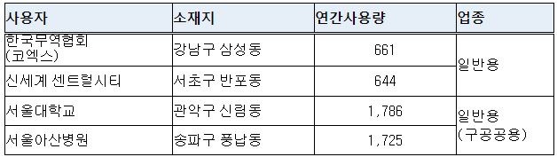 대학‧대학병원 가운데에는 서울대학교(관악구 신림동 소재)와 서울아산병원(송파구 풍납동 소재)이 수돗물 사용량 상위 건물로 집계됐다. 이들 건물은 연간 약 170여만 톤을 사용했는데, 불특정 다수의 시민이 사용하는 업태 특성이 반영된 것으로 보인다.