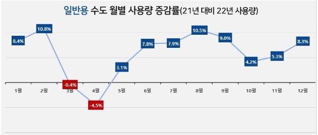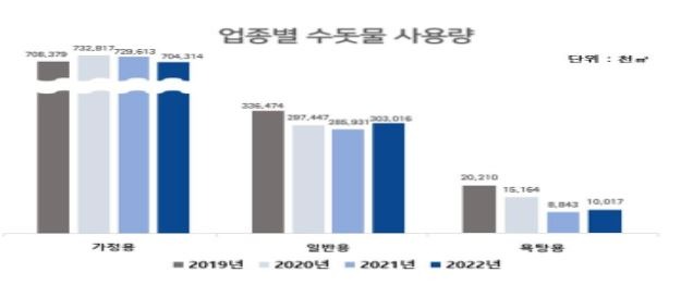 지난해 업종별 수돗물 소비 키워드는 ‘코로나19로부터의 회복’이다. 작년 한 해 상업시설과 공공시설에서 사용하는 ‘일반용’과 대중목욕탕에서 사용하는 ‘욕탕용’ 사용은 늘고, ‘가정용’ 사용은 줄었는데, 이는 팬데믹 기간 ‘가정용’은 늘고 ‘일반용․욕탕용’이 줄었던 것과 정반대로 나타났다.