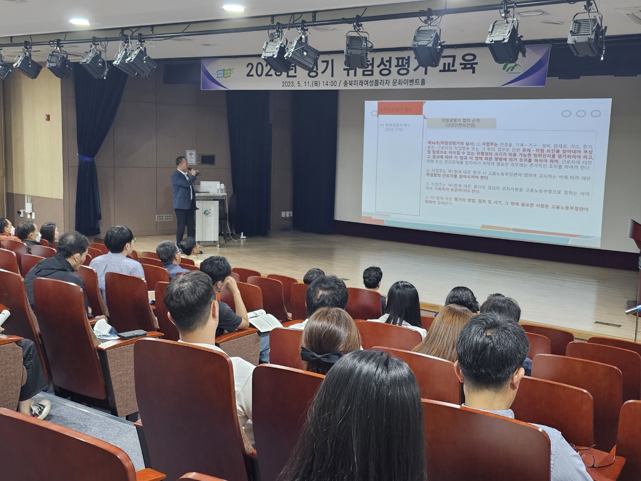 충북도는 5월 11일 충북미래여성플라자에서 중대재해예방을 위한 위험성평가 담당자 정기 교육을 실시했다.