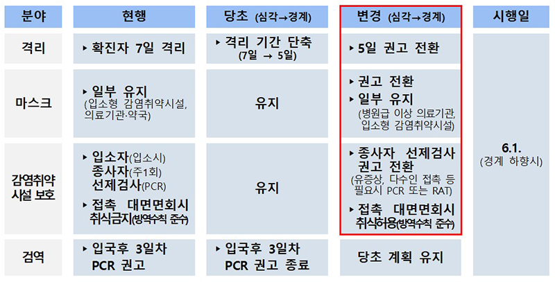 또한 6월부터 입국 후 3일차 PCR 검사 권고도 종료하고 선별진료소는 운영하지만 임시선별검사소 또한 중단한다.