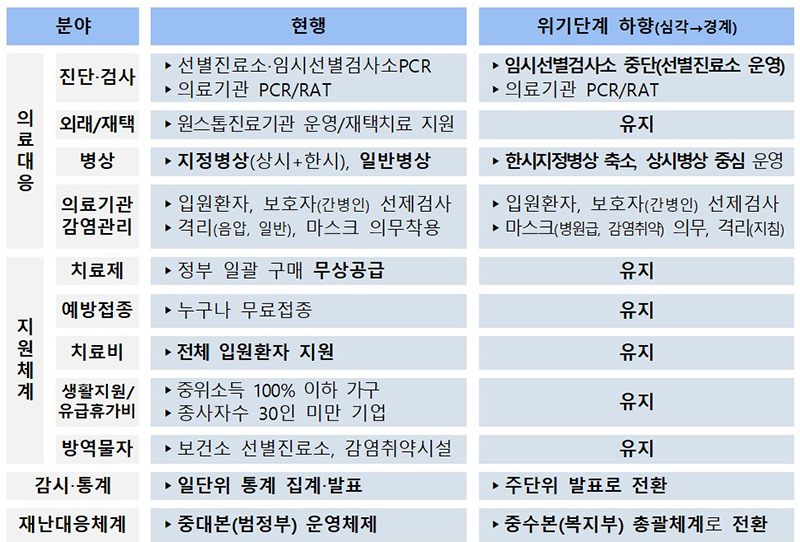 이 외에 매일 발표하는 확진자 통계는 주단위로 전환하고, 위기단계 하향에 따라 범정부 대응인 중앙재난안전대책본부에서 중앙사고수습본부 중심의 재난위기 총괄 체계로 전환한다.