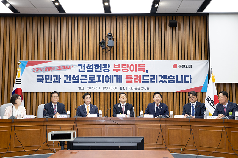 국민의힘과 정부는 11일 국회에서 민당정 협의회를 열고 지난 2월21일 마련한 ‘건설현장 불법행위 근절대책’ 후속조치로 ‘건설현장 정상화 5대 법안’ 개정을 신속하게 추진하기로 했다고 밝혔다. 5대 법안은 건설산업기본법, 건설기계관리법, 사법경찰직무법, 채용절차법, 노동조합법이다.