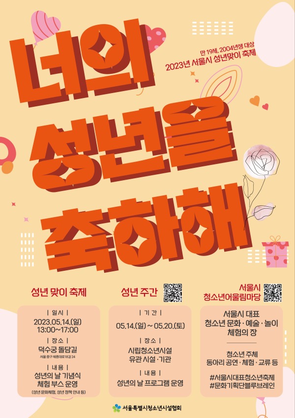 서울시는 제51회 성년의 날을 맞아 5월 14일 일요일 오후 1시부터 오후 5시까지 덕수궁 돌담길(차 없는 거리)에서 올해로 만 19세가 되는 2004년생들의 성년들을 대상으로 성년 맞이 행사를 개최한다.