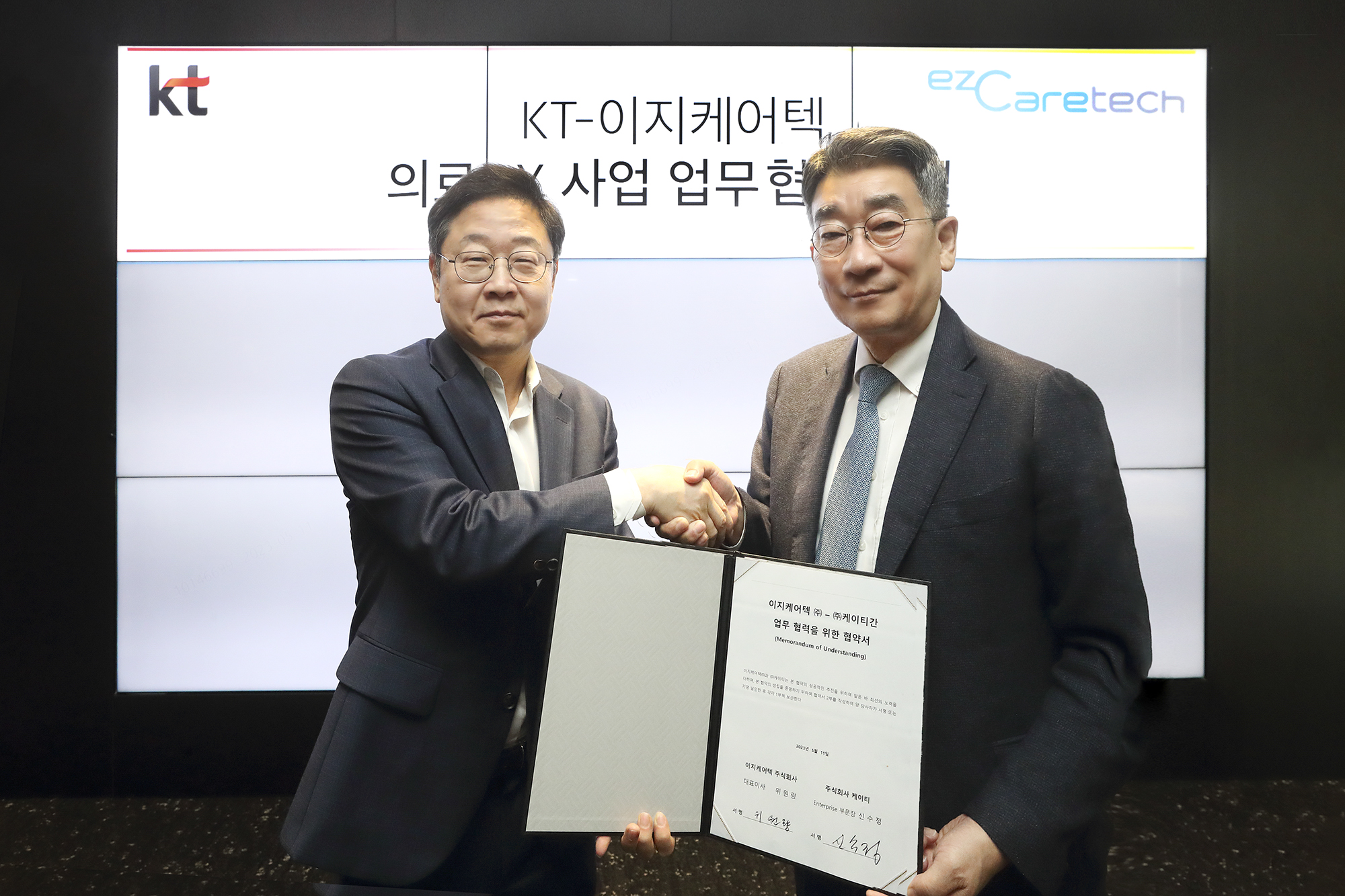 KT(www.kt.com)가 이지케어텍과 디지털전환(DX)에 기반을 둔 헬스케어 사업을 공동으로 추진한다고 12일 밝혔다. 양사는 11일 서울 송파구 KT 송파빌딩에서 이와 관련한 한 업무협약(MOU)을 체결했다.