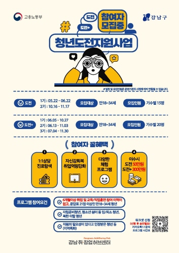 참여희망자는 워크넷 또는 강남취·창업허브센터 홈페이지에서 신청하면 된다. 도전 1기 접수 마감은 오는 17일까지며, 22일부터 프로그램을 수강할 수 있다. 자세한 내용은 홈페이지 모집공고를 참조하거나 운영사무국으로 문의하면 된다.