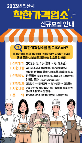 전북 익산시는 서민경제와 물가안정에 기여하는 '착한가격업소'를 15일부터 다음 달 9일까지 신규 모집한다.