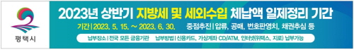 경기 평택시는 조세 정의 실현 및 지방재정의 건전성 확보를 위해 오는 6월 말까지를 '상반기 지방세·세외수입 체납액 일제정리기간'으로 정하고 체납액 징수에 전 행정력을 집중하기로 했다.