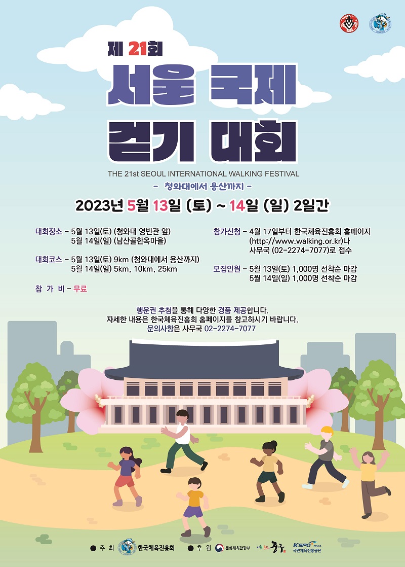 문화체육관광부가 후원하고 한국체육진흥회가 주최하는 이번 제21회 서울국제걷기대회는 청와대 개방과 용산시대 개막 1주년을 기념해 13일 청와대에서 시작해 용산어린이정원에 도착하는 코스로 운영한다.