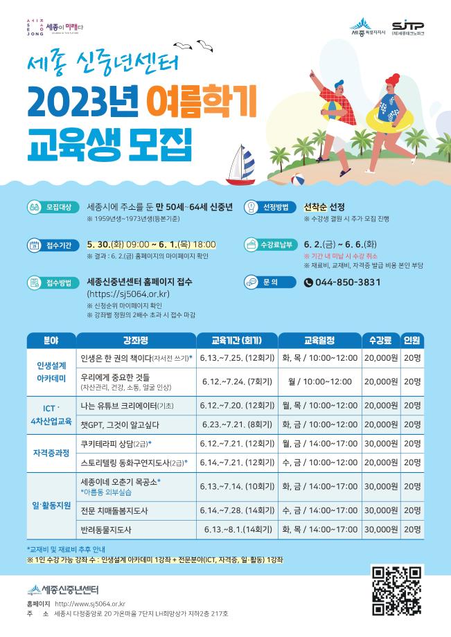 세종특별자치시가 (재)세종테크노파크와 내달부터 세종신중년센터 여름학기 교육을 진행하는 가운데, 오는 30일부터 6월 1일 18시까지 수강생을 모집한다.