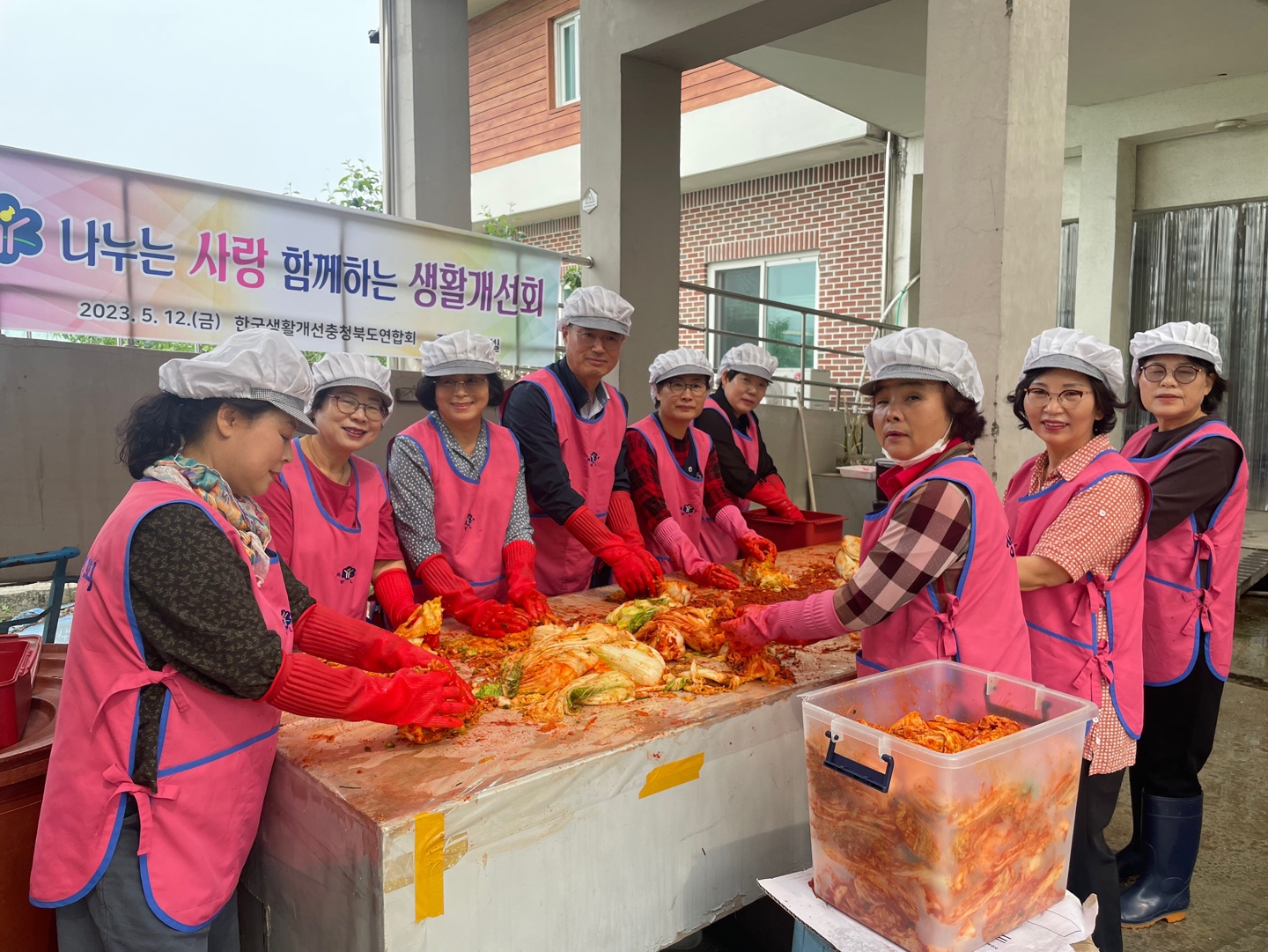 도 생활개선연합회 김치담그기 행사는 봉사활동의 참된 의미를 되새기며 나눔의 기쁨을 함께하는 의미에서 매년 추진하고 있다. 이번 봉사활동은 청주시 북이면 사회복지시설 다온빌에서 김치 100포기를 손수 담가 소정의 간식과 함께 전달하였다.