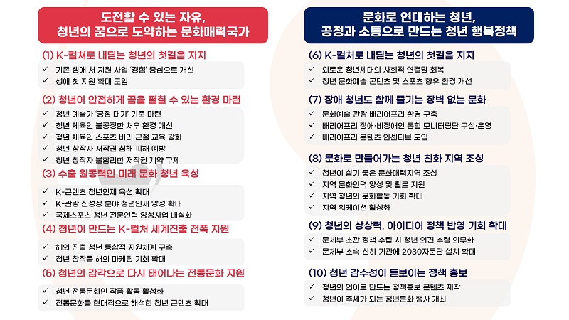 10대 과제의 세부 과제는 ▲청년 예술가가 공연 준비에 투입한 노력 등을 보상하도록 하는 ‘공정대가’ 기준 수립 ▲청년 장애인이 직접 문화기반시설의 장애인 이용 편의성을 점검해 개선방안 마련 ▲향후 문체부 소관 정책을 수립할 때 의무적으로 청년세대 의견 수렴 등이 있다.
