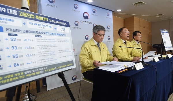 홍남기 경제부총리 겸 기획재정부 장관, 이재갑 고용노동부 장관, 은성수 금융위원장은 이날 오후 정부서울청사에서 이같은 내용의 비상경제대책회의 결과를 발표했다.