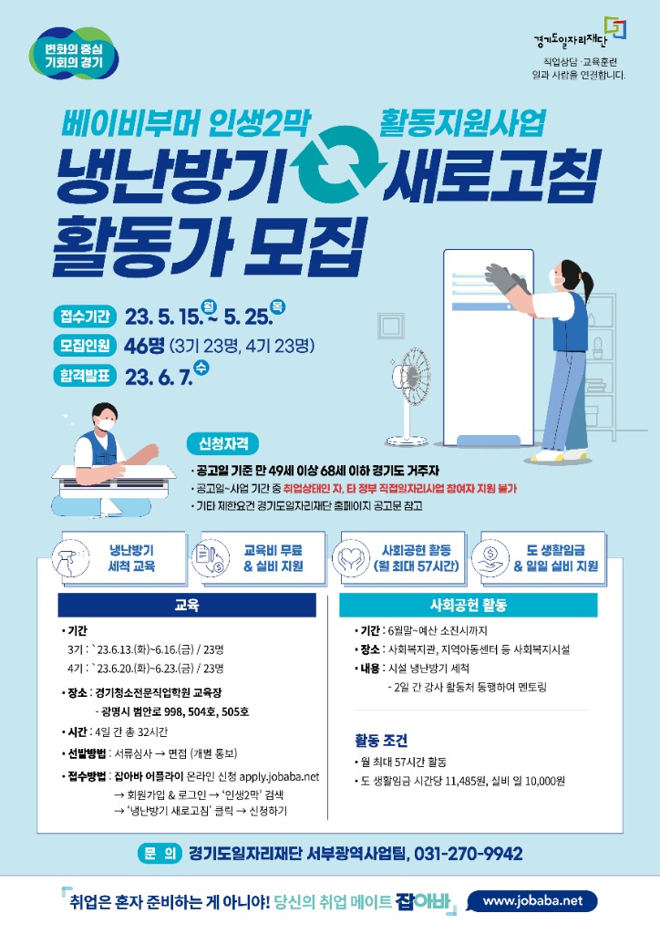 냉난방기 새로고침 활동가 모집 공고문과 잡아바 어플라이(https://apply.jobaba.net/)에서 온라인 신청을 받고 있으며, 자세한 사항은 경기도일자리재단 서부광역사업팀(☎031-270-9942)으로 문의하면 된다.