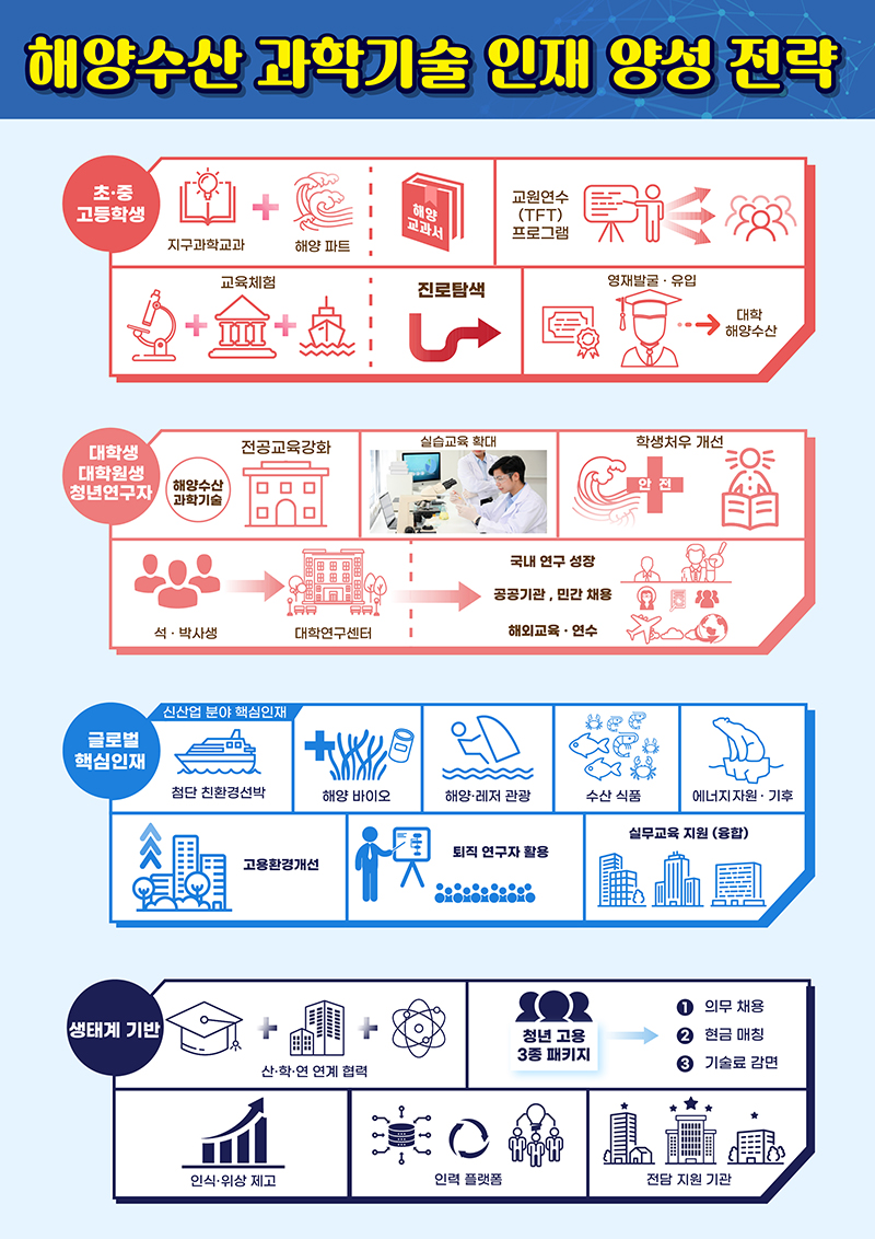 먼저, 초·중등 지구과학 교과서에 해양수산 과학기술 파트를 올해부터 확대하도록 하고 고등학교 전용 ‘해양교육 교과서’ 개발·보급을 추진하는 등 해양수산 과학기술 분야 기초교육을 강화한다.