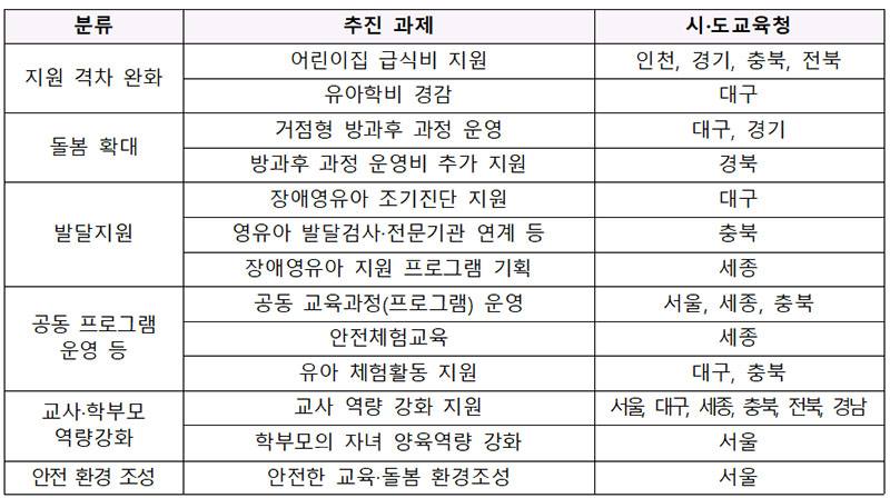 또 어린이집 급식비 지원, 유치원·어린이집 공동 교육과정 운영 등 13개 과제에 총 482억 원(교육청 424억 원·지자체 58억 원)을 지원받는다.