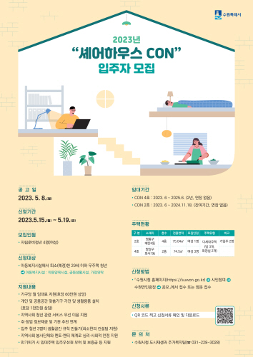셰어하우스 CON 2호(영통구 매탄4동)에 입주할 청년 1명, 4호(팔달구 화서1동)에 입주할 청년 3명을 모집한다. 2호는 2024년 11월 18일까지, 4호는 2025년 6월까지 거주할 수 있다(연장 없음). 2호에는 현재 청년 2명이 거주하고 있다.