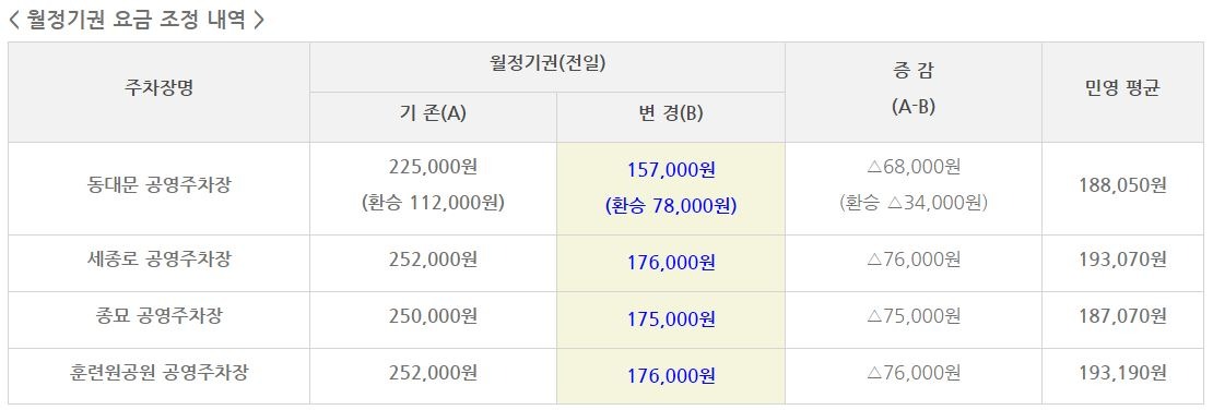 서울시는 공영주차장 이용 활성화와 쾌적하고 저렴한 주차편의를 제공하기 위해 6월 1일(목)부터 동대문, 세종로, 종묘, 훈련원공원 공영주차장 등 도심권 공영주차장 4곳의 월정기권 요금을 30% 인하한다고 밝혔다. 이에 따라 인근지역 민영주차장 요금 평균 대비 저렴한 수준으로 월정기권을 이용할 수 있게 되면서 고물가시대에 주차요금 부담을 덜 수 있을 것으로 전망된다.