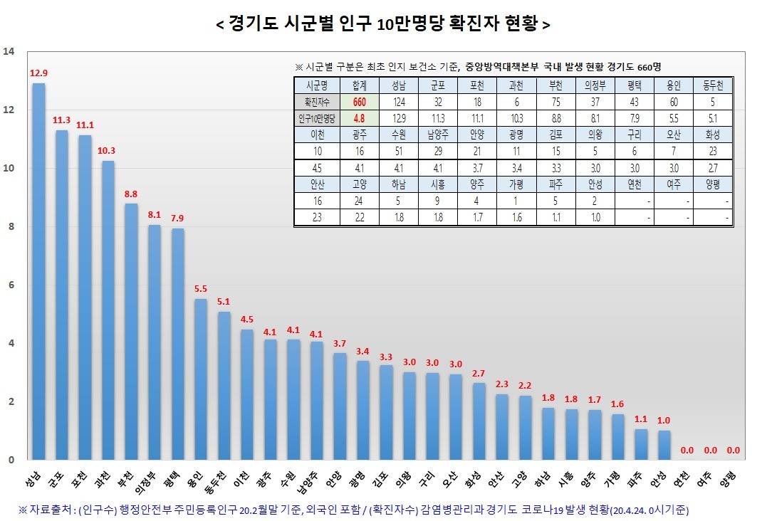 한편 23일 0시 기준 경기도 확진자수는 660명으로 전일 0시 대비 1명 증가했다.(전국 1만708명) 인구100만 명 당 확진자 발생 수는 48.2명으로 전국 17개 시도 중 6번째다. 경기도 확진자 중 443명은 퇴원했고, 현재 203명이 병원 및 생활치료센터에서 격리 중이다. 4월 1일 이후 도내 발생한 확진자 159명 중 35.2%에 해당하는 56명이 해외입국자다.