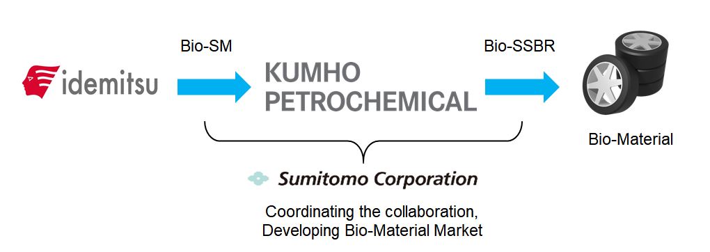 이데미츠코산은 일본 최대 SM 제조사로, 금호석유화학은 이데미츠코산이 공급하는 바이오 SM을 사용하여 주력 제품 중 하나인 고 기능성 타이어용 합성고무 SSBR을 생산한다. 또한 일본 스미토모상사는 양사의 협력을 조율하고 바이오 폴리머 시장을 개발하는 역할을 수행한다. 협력에 참여하는 회사들은 2024년까지 바이오 SSBR의 생산에 돌입할 계획이다.