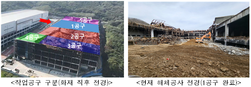 2021년 화재로 건축물이 전소된 덕평물류센터는 원거리 압쇄(Crusher) 공법으로 1∼5공구가 순차 해체된다.