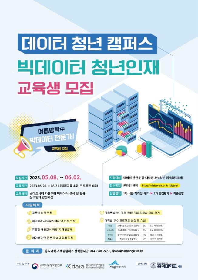 데이터 청년 캠퍼스 사업은 한국데이터산업진흥원이 주관하는 데이터 분야 전문 인력 양성을 위한 사업으로, 세종지역에서는 홍익대 세종캠퍼스가 운영기관에 선정됐다.