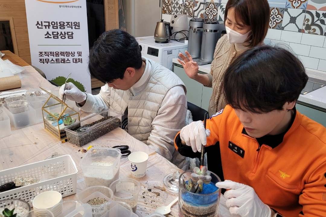 ‘신규직원 소담상담’은 경기도북부소방재난본부 및 11개 소방관서에 소속된 총 140명의 신규 소방공무원들을 대상으로 올해 처음으로 운영됐다. 개인상담, 스트레스 측정, 외상후 스트레스장애(PTSD) 예방·생명지킴이 교육, 조직에서의 나 강점 찾기, 다도, 원예 치유, 미술 치유 등 다양한 프로그램으로 구성됐다.