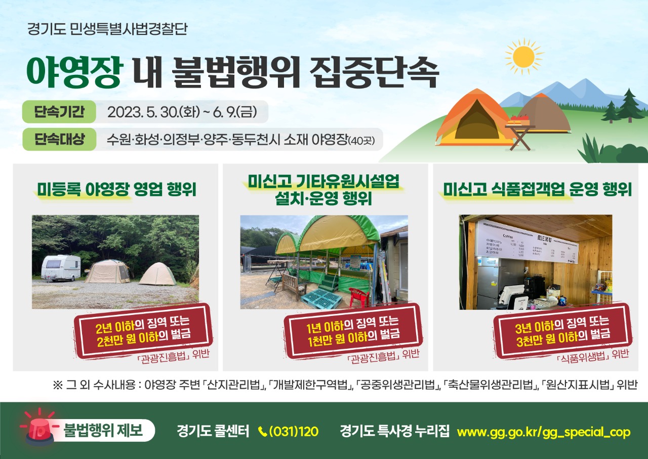 경기도 특별사법경찰단이 캠핑철을 맞아 5월 30일부터 6월 9일까지 수원시, 화성시, 의정부시, 양주시, 동두천시에 소재한 야영장 40곳을 대상으로 불법행위를 집중 단속한다.