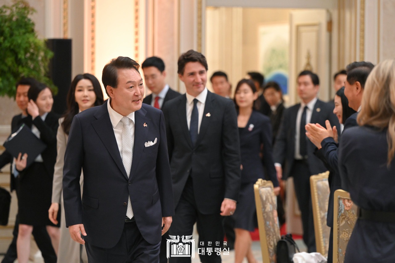 윤석열 대통령 부부는 17일 한-캐나다 정상회담이 끝난 후 청와대 영빈관으로 저스틴 트뤼도 총리를 초청해 만찬을 가졌다.