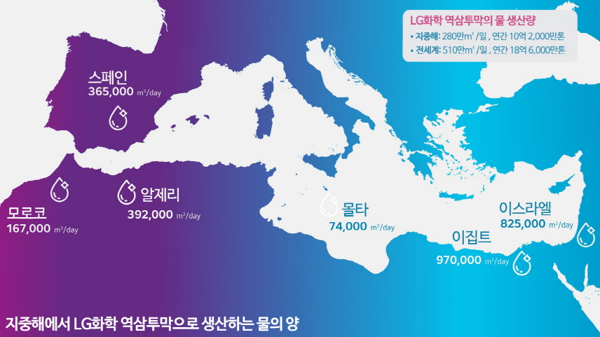 이스라엘 지역 대형 수주를 바탕으로 LG화학은 지중해 지역 시장 점유율 확대에 나설 계획이다. LG화학은 수처리 필터 사업을 시작한 2014년부터 현재까지 꾸준히 수주량을 늘려 현재 LG화학의 역삼투막으로 정수하는 물은 연간 18억 6,000만톤*이다. 이 중 이집트, 스페인령 카나리아 제도 등에서는 전체 물 수요량의 50% 이상을 LG화학의 역삼투막에 의존하고 있다.