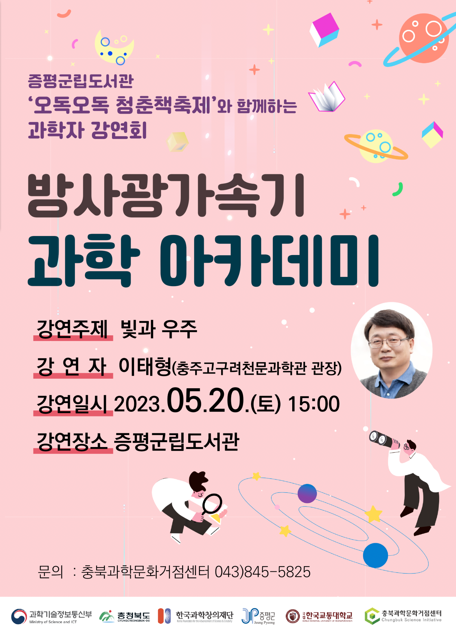 이번 가속기아카데미는 증평군립도서관의 ‘오독오독 청춘책축제’와 함께 진행되며 이태형 충주고구려과학관장이 『빛과 우주』라는 주제로 강연을 하게된다.