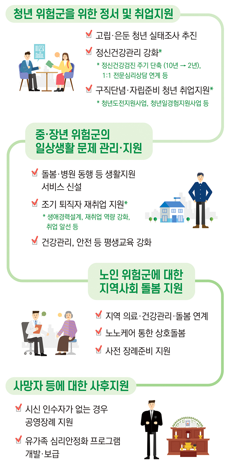 한편 시신 인수자가 없는 고독사 사망자에 대한 공영장례를 확대하고 고독사 시신 발견·수습 과정에서 유가족·주변인들이 겪는 정신적 외상에 대한 심리안정화 프로그램을 개발한다.